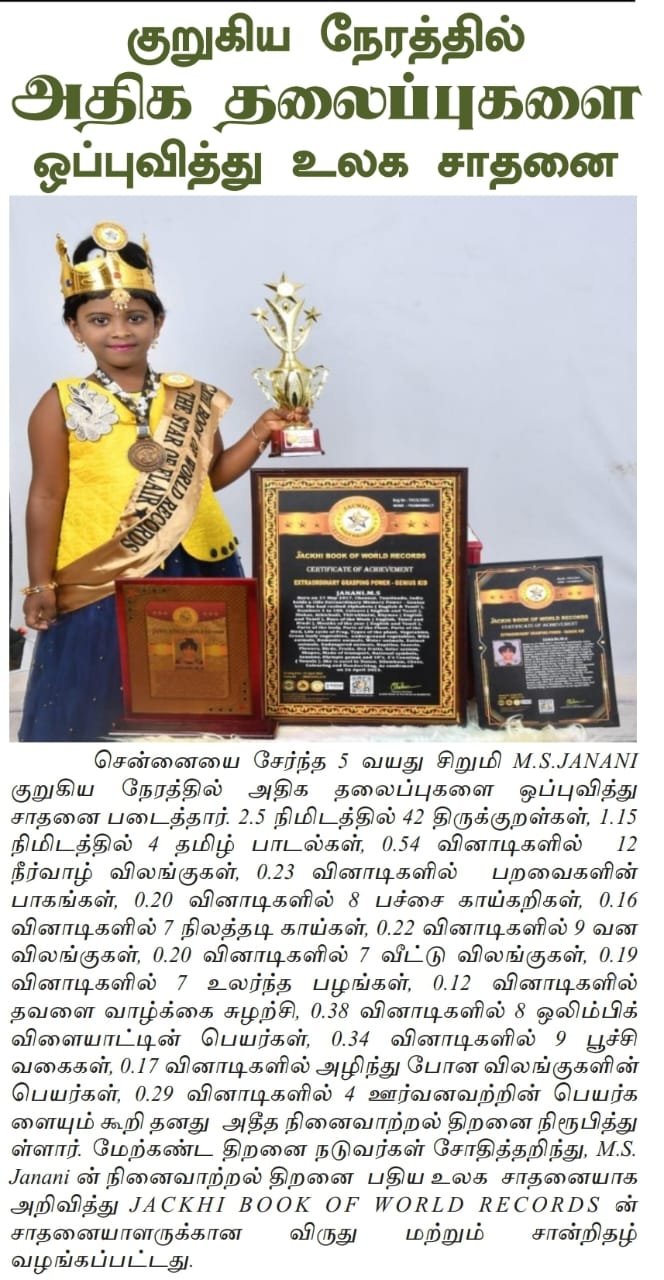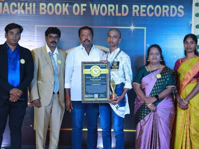 JACKHI BOOK OF WORLD RECORDS ( JBWR ) originated from JACKHI CREATIONS which has been offering a wide variety of competitions, programs and training since 2006. Its primary objective is to bring out talents. JBWR started the journey to recognize achievers in 2019 and released the first achievers book in 2021. JBWR finds the extraordinary people's unique feats and documenting the achievements in every fields.
