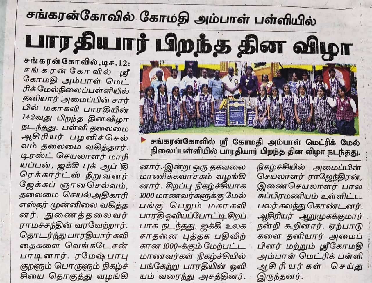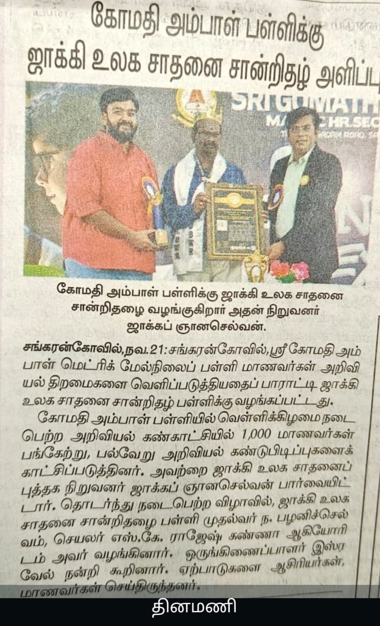 jbuser2026-01-16T19:41:33+05:30SRI GOMATHI AMBAL MATRICULATION HIGHER SECONDARY SCHOOL, Sankarankovil, Tenkasi District, Tamil Nadu, India made history by organizing a...
