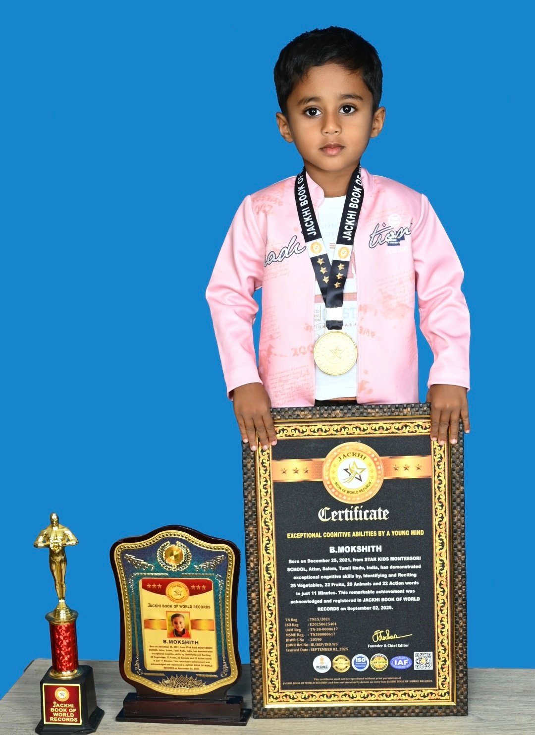 B.MOKSHITH, born on December 25, 2021, from STAR KIDS MONTESSORI SCHOOL, Attur, Salem, Tamil Nadu, India, has demonstrated exceptional cognitive skills by Identifying and Reciting 25 Vegetables , 22 Fruits, 20 Animals and 22 Action words in just 11 minutes
