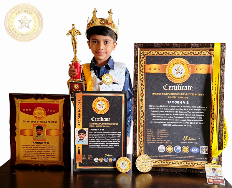 TAMOGH V B (Born: June 30, 2020) of Bengaluru, Karnataka, India, achieved a remarkable feat by accurately reciting the 1 to 20 Multiplication Tables in just 4 minutes and 57 seconds.