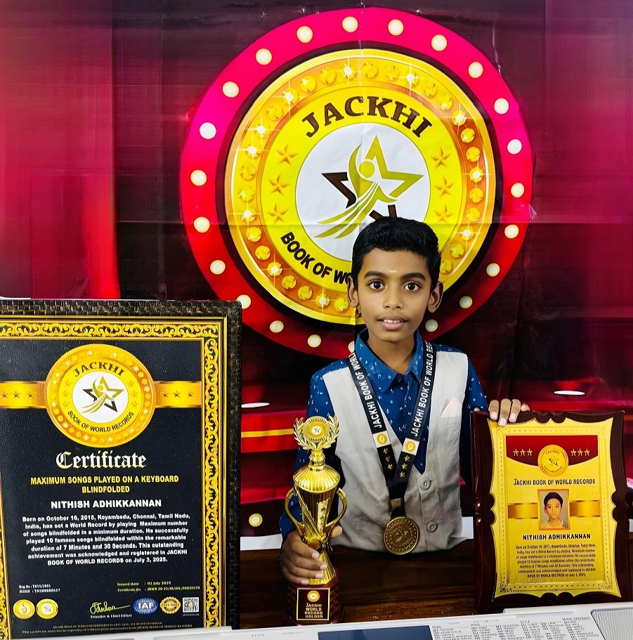 born on October 16, 2015, Koyambedu, Chennai, Tamil Nadu, India, has set a World Record by playing Maximum number of songs blindfolded in a minimum duration. He successfully played 10 famous songs blindfolded within the remarkable duration of 7 minutes and 30 seconds.