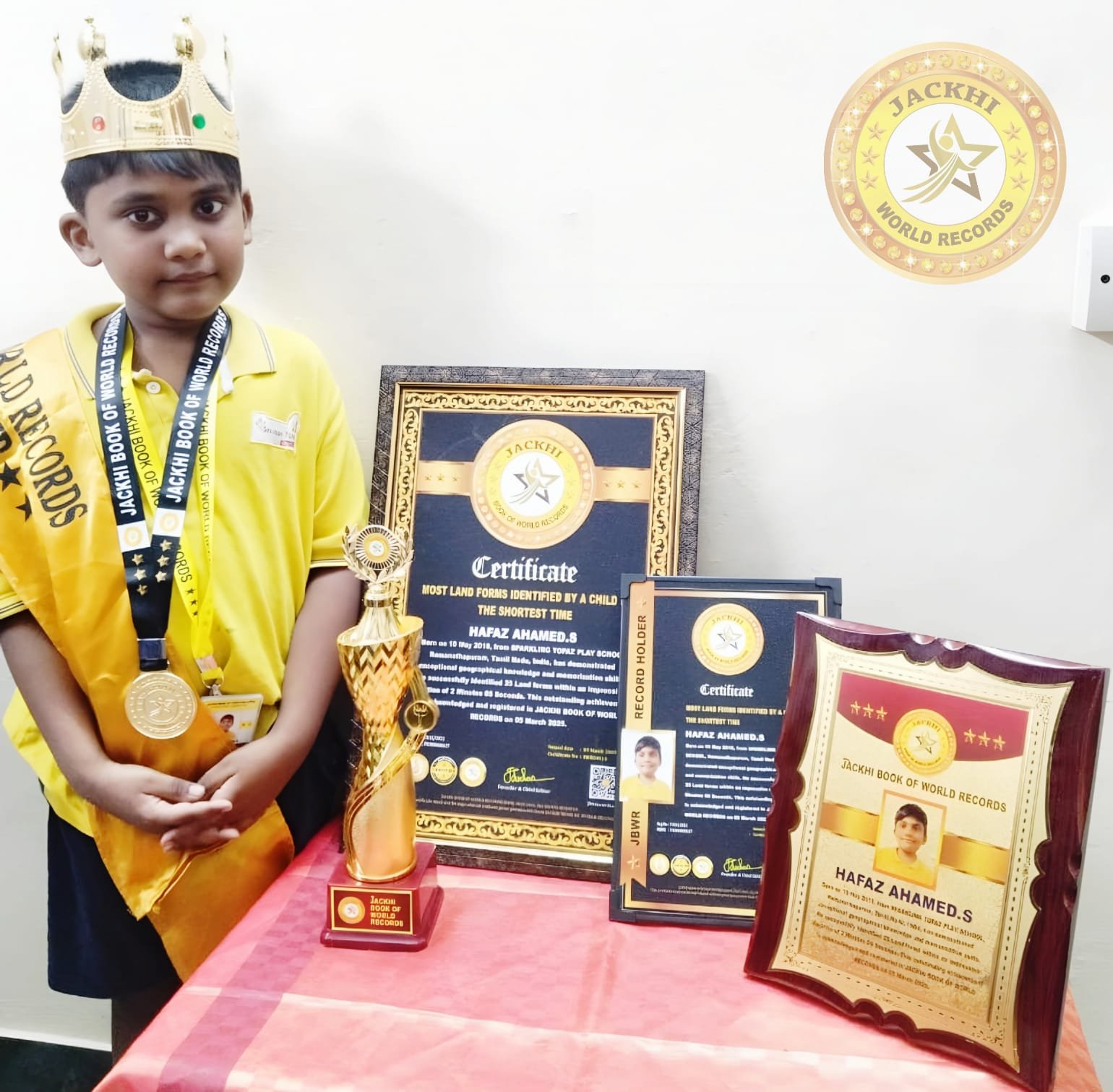HAFAZ AHAMED.S, born on 10 May 2018, from SPARKLING TOPAZ PLAY SCHOOL, Ramanathapuram, Tamil Nadu, India, has demonstrated exceptional geographical knowledge and memorization skills. He successfully Identified 35 Land forms within an impressive duration of 2 minutes 05 seconds.