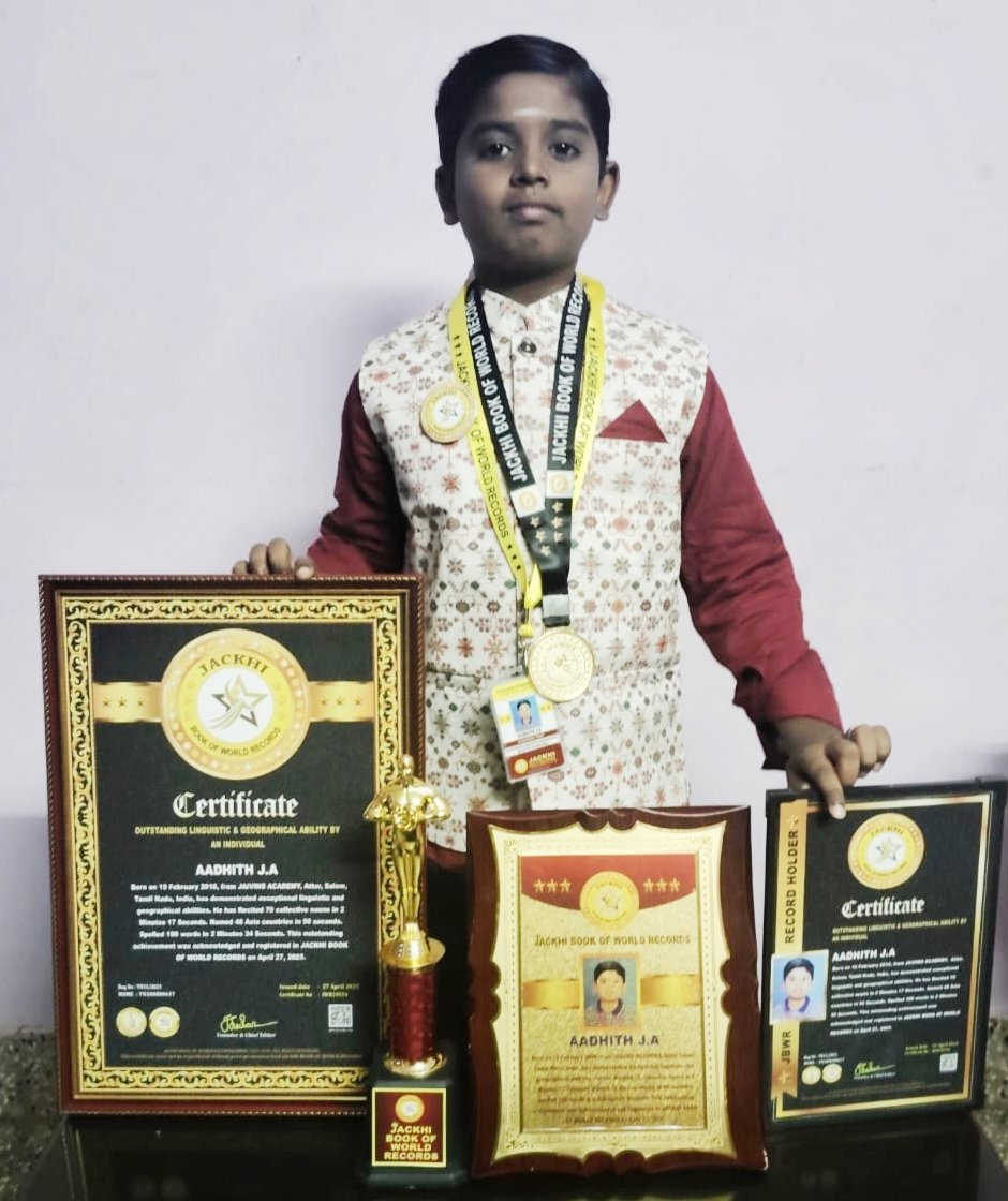 AADHITH J.A, born on 19 February 2016, from JAIVINS ACADEMY, Attur, Salem, Tamil Nadu, India, has demonstrated exceptional linguistic and geographical abilities. He has Recited 70 collective nouns in 2 minutes 17 seconds. Named 48 Asia countries in 50 seconds. Spelled 100 words in 2 minutes 34 seconds.