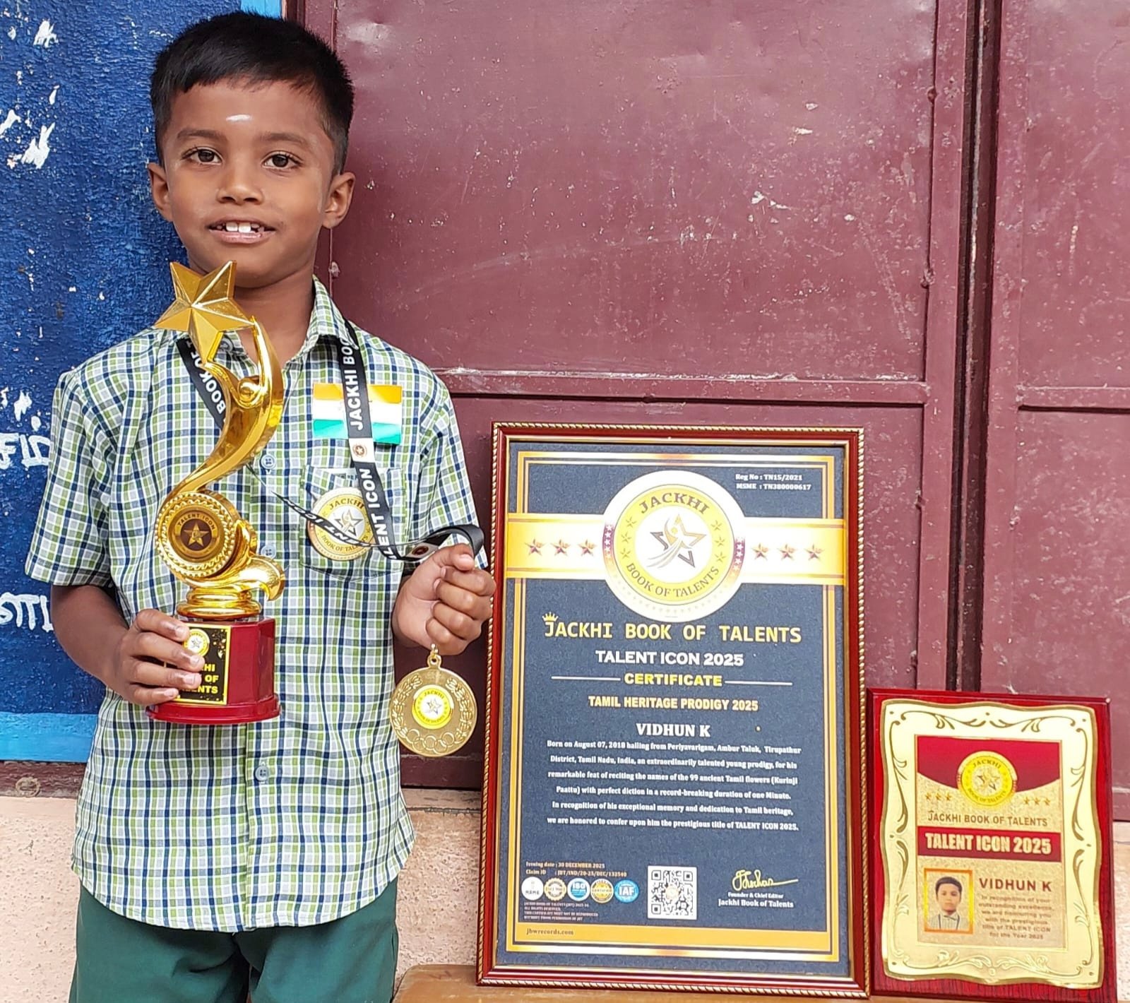VIDHUN K, born on August 07, 2018 hailing from Periyavarigam, Ambur Taluk, Tirupathur District, Tamil Nadu, India, an extraordinarily talented young prodigy, for his remarkable feat of reciting the names of the 99 ancient Tamil flowers (Kurinji Paattu) with perfect diction in a record-breaking duration of one minute. In recognition of his exceptional memory and dedication to Tamil heritage.