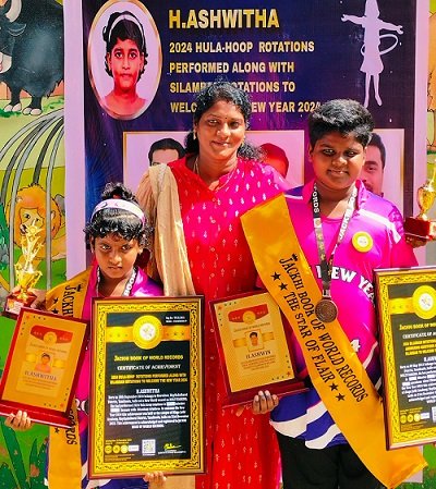 H.ASHWITHA, Born on 18th September 2014 belongs to Moovaloor, Mayiladuthurai District, Tamilnadu, India set a New World record on MULTITASKING. She had performed 2024 Hula hoop rotations in 33 Minutes 24 Seconds. To welcome the New Year 2024 this achievement was held at the campus of Alagu Jothi Academy, Mayiladuthurai District, Tamilnadu, India on 31st December 2023.