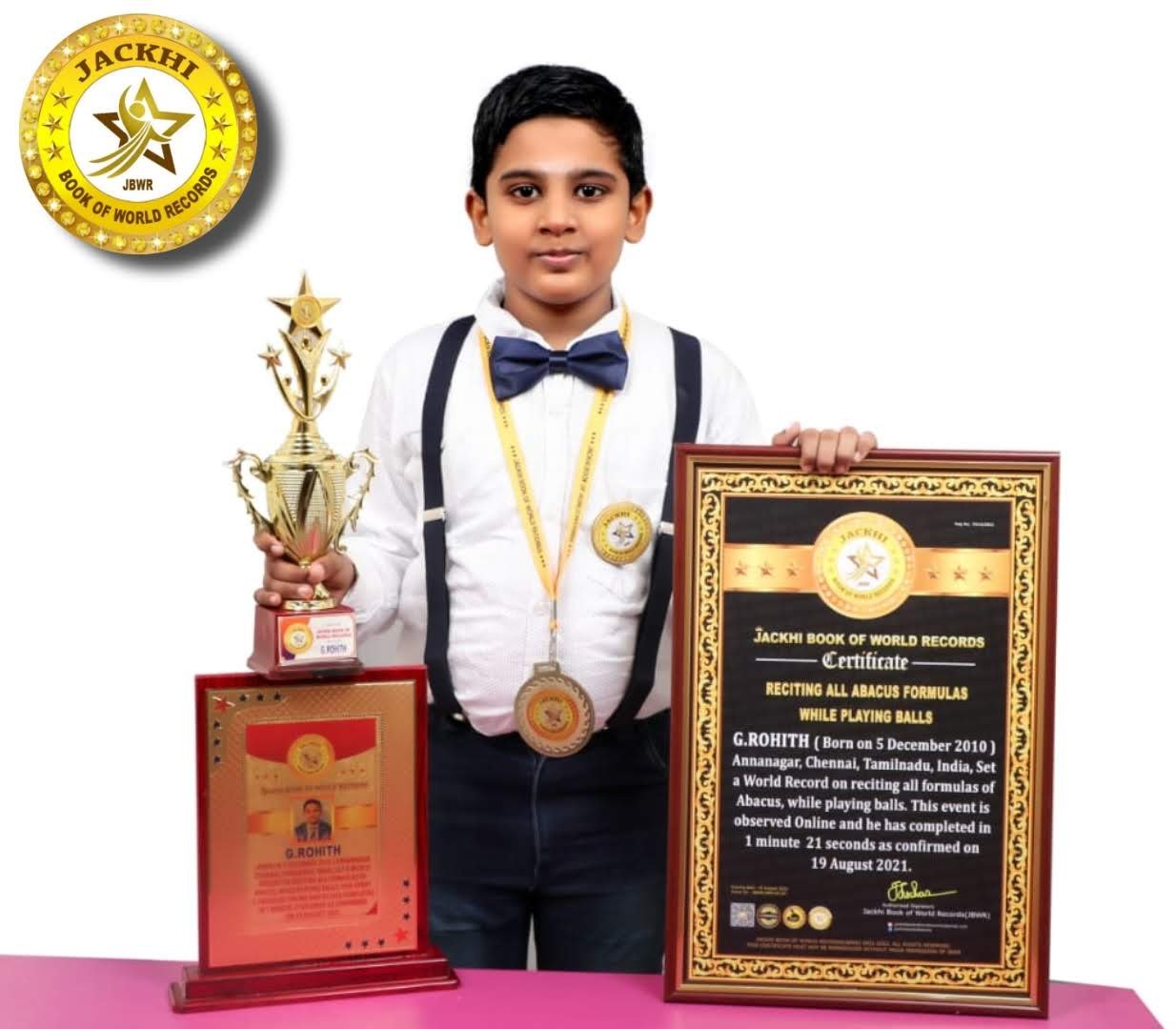 G.ROHITH Born on 5 December 2010, Annanagar, Chennai , Set a World Record on reciting the abacus formulas while playing balls. this event is observed online and he has completed in 1 minute 21 seconds, as confirmed on 19 August 2021.