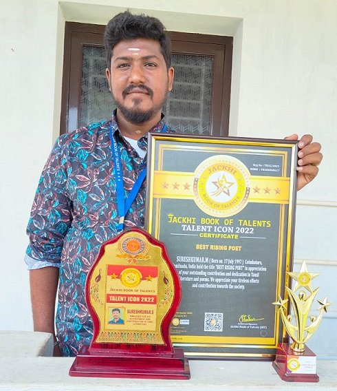 SURESHKUMAR. M, Born on 17 July 1997, Coimbatore, Tamilnadu, India hold the title "BEST RISING POET" in appreciation of your outstanding contribution and dedication in Tamil literature and poems. We appreciate your tireless efforts and contribution towards the society.