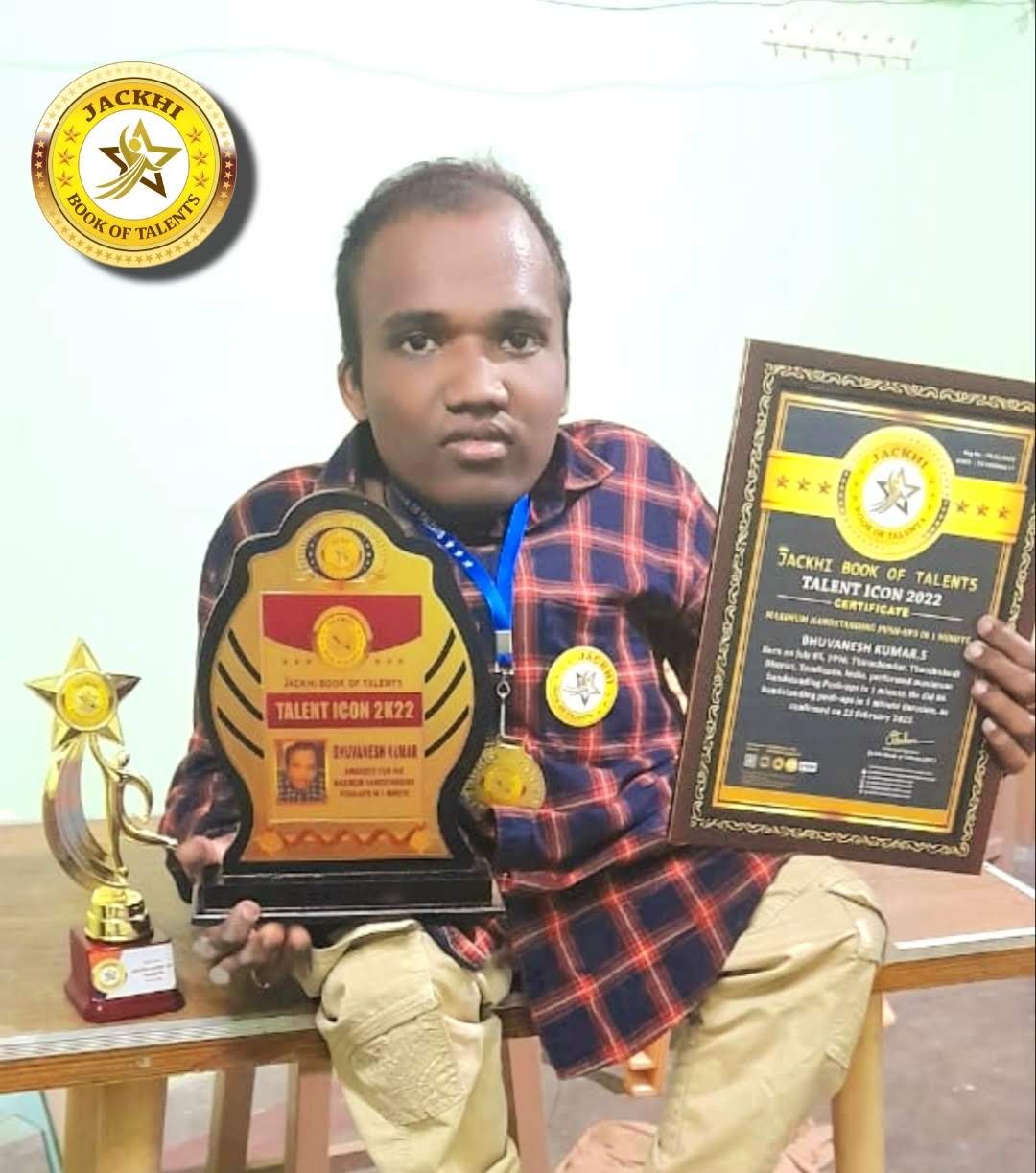 BHUVANESH KUMAR.S, Born on July 05, 1996, Thiruchendur, Thoothukudi District, Tamilnadu, India, performed maximum handstanding Push-ups in 1 minute. He did 86 handstanding push-ups in 1 minute duration,as confirmed on 23 February 2022.