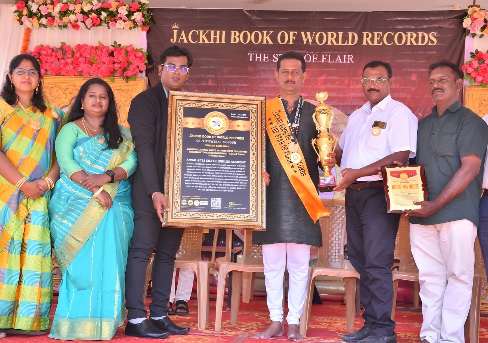 ANNAI ARTS SILVER JUBILEE ACADEMY, Tenkasi, Tamilnadu, India has successfully organized a massive world record event, titled TENKASI SANGAMAM showcasing the classical dance form Bharatanatyam, to pay a grand tribute to Mother Nature, on the theme PANCHABOOTHAM. 115 talented classical dance artistes from ANNAI ARTS SILVER JUBILEE ACADEMY have performed Bharatanatyam in unison, demonstrating precision, grace, and dedication.
