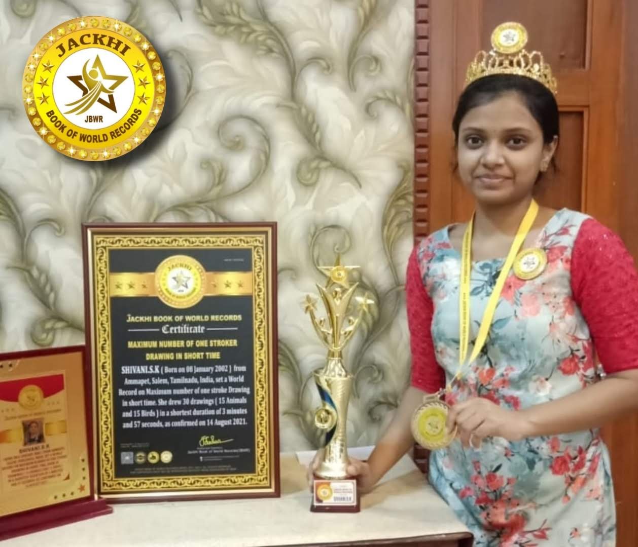 SHIVANI.S.K ( Born on 8 January 2002 ) from Ammapet,Salem, Tamilnadu, India set a World record on maximum number of one stroke Drawing in short time. She drew 30 drawings ( 15 Animals and 15 birds) in a shortest duration of 3 minutes and 57 seconds,as confirmed on 14th August 2021.
