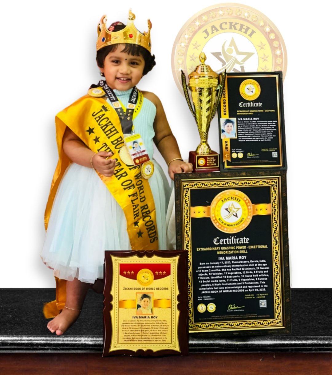 IVA MARIA ROY, Born on January 17, 2023, Thamarassery, Kerala, India, possesses an extraordinary memorization skill at the age of 2 Years 2 months. She has Recited 32 Animals, 29 General objects, 12 Vehicles, 13 Vegetables, 12 Birds, 8 Fruits and 7 Colours. Identified 18 Body parts, 16 House hold articles, 13 Social media icons, 11 Fruits, 9 Vegetables, 9 Famous peoples, 6 Music instruments and 5 Professions.