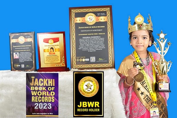 SAHASRAA POORNIMA.G, Born on 22 February 2019, Jaihindpuram, Madurai, Tamilnadu, India Set a World Record by Identifying and reciting variety of things at the tender age of 3 years 9 months. She has identified and recited 27 Animals, 26 English Alphabets, 23 Professionals, 13 Colours, 12 Shapes, 12 Uyir eluthukkal, 7 Colours, Months of the year ( Tamil and English), Days of the Week, 7 Continents, 7 Planets, 5 Vowels, 5 Thirukkural, 4 seasons and Athichudi.