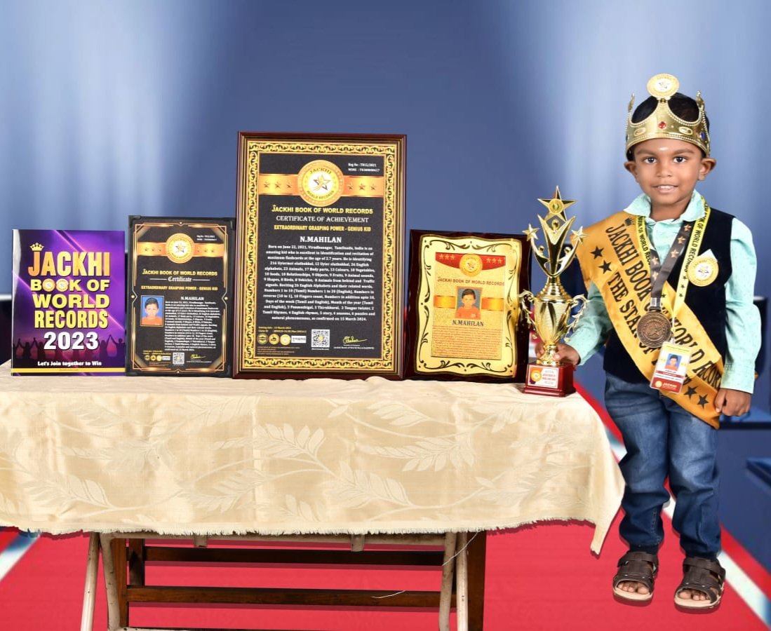 N.MAHILAN, Born on June 22, 2021, Virudhunagar, Tamilnadu, India is an amazing kid who is excellent in Identification and recitation of maximum flashcards at the age of 2.7 years. He is Identifying 216 Uyiermei eluthukkal, 12 Uyier eluthukkal, 26 English alphabets, 23 Animals, 17 Body parts, 13 Colours, 10 Vegetables, 10 foods, 10 Relationships, 9 Objects, 9 Fruits, 9 Animal sounds, 9 Shapes, 8 Birds, 8 Vehicles, 8 Animals from behind and Traffic signals. Reciting 26 English Alphabets and their related words, Numbers 1 to 10 ( Tamil) Numbers 1 to 20 ( English), Numbers in reverse ( 10 to 1 ), 10 Fingers count, Numbers in addition upto 10, Days of the week ( Tamil and English), Month of the year ( Tamil and English), 3 Ponmozhigal, 3 Thirukkural, 3 Tongue twister, 2 Tamil Rhymes, 4 English rhymes, 5 story, 4 seasons, 6 puzzles and natural phenomenons.