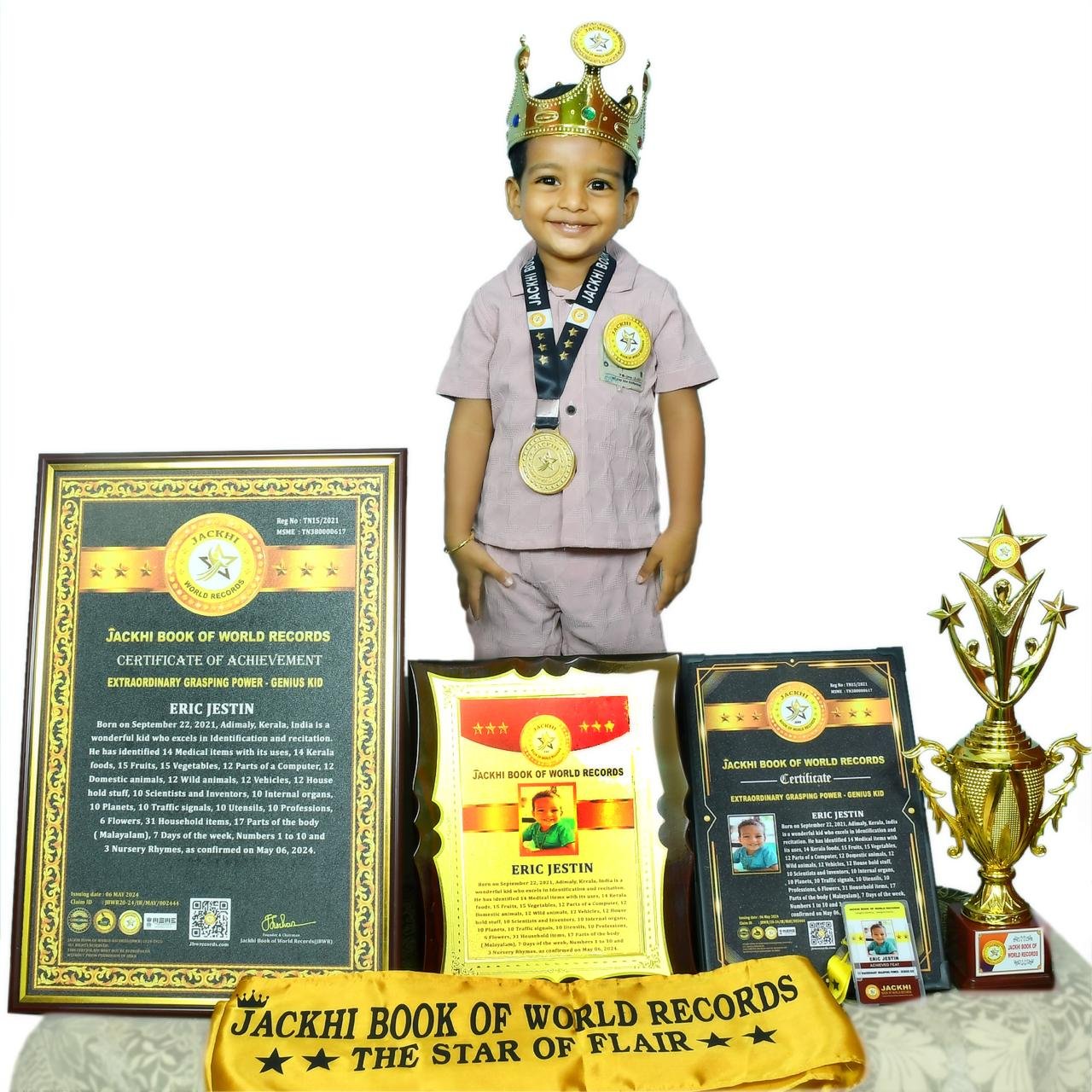 ERIC JESTIN, Born on September 22, 2021, Adimaly, Kerala, India is a wonderful kid who excels in Identification and recitation. He has identified 14 Medical items with its uses, 14 Kerala foods, 15 Fruits, 15 Vegetables, 12 Parts of a Computer, 12 Domestic animals, 12 Wild animals, 12 Vehicles, 12 House hold stuff, 10 Scientists and Inventors, 10 Internal organs, 10 Planets, 10 Traffic signals, 10 Utensils, 10 Professions, 6 Flowers, 31 Household items, 17 Parts of the body ( Malayalam), 7 Days of the week, Numbers 1 to 10 and 3 Nursery Rhymes.