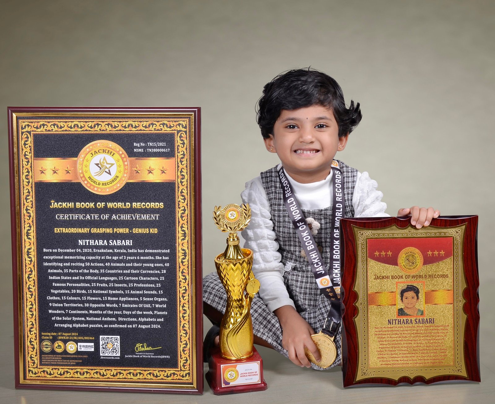 NITHARA SABARI, Born on December 04, 2020, Ernakulam, Kerala, India has demonstrated exceptional memorizing capacity at the age of 3 years 6 months. She has Identifying and reciting 50 Actions, 40 Animals and their young ones, 40 Animals, 35 Parts of the Body, 35 Countries and their Currencies, 28 Indian States and Its Official Languages, 25 Cartoon Characters, 25 Famous Personalities, 25 Fruits, 25 Insects, 25 Professions, 25 Vegetables, 20 Birds, 15 National Symbols, 15 Animal Sounds, 15 Clothes, 15 Colours, 15 Flowers,15 Home Appliances, 5 Sense Organs, 9 Union Territories, 30 Opposite Words, 7 Emirates Of UAE, 7 World Wonders, 7 Continents, Months of the year, Days of the week, Planets of the Solar System, National Anthem, Directions, Alphabets and Arranging Alphabet puzzles.