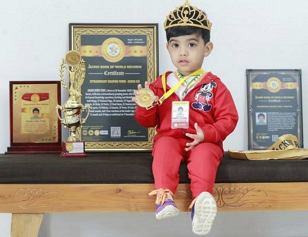 ADAM JOHN PAUL, Born on 30 November 2020 , Wayanad, Kerala, India has a extraordinary grasping power, who is answering 44 Geberal knowledge questions, Reciting and Identifying 39 House hold things, 37 National flags, 35 Animals, 29 Vegetables, 27 Sea animals, 26 Birds, 24 Fruits, 22 Food items, 22 Famous personalities, 17 Body parts, 14 Vehicles, 12 Insects, 10 Trees, 10 Cars, 8 Flowers, 7 Animal sounds, and 5 face reactions at the tender Age of 1 years 11 month and 19 days.