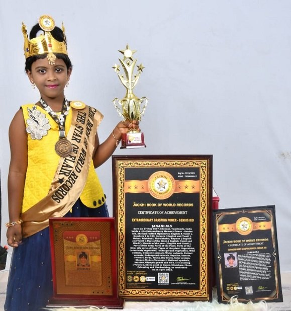 JANANI.M.S, Born on 17 May 2017, Chennai, Tamilnadu, India holds a title Extraordinary Memory Power - Genius kid. She had recited Alphabets ( English & Tamil), Numbers 1 to 100, Colours ( English and Tamil), Slokas, Athichudi, Thirukkural, Rhymes ( English and Tamil), Days of the Week ( English, Tamil and Hindi), Months of the year ( English and Tamil), Parts of the body, Parts of the Plant, Parts of the Bird, Life cycle of Frog, Types of the plant, Vegetables, Green leafy vegetables, underground vegetables, Wild animals , Domestic animals, Water animals, Extinct animals, Endangered animals, Reptiles , Insects, Flowers, Birds, Fruits , Dry fruits, Solar system, Shapes, Mode of transport, National symbols, Seasons, Olympic games and 10's ,5's Counting ( Vowels ). She is excel in Dance, Silambam, Chess , Colouring and Handwriting.
