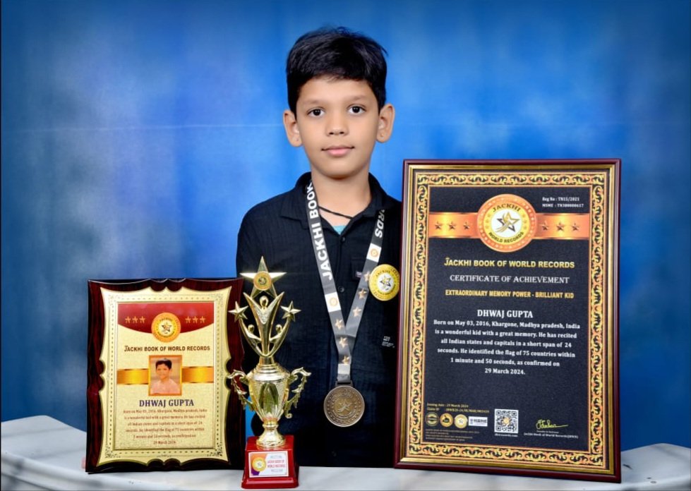 DHWAJ GUPTA Born on May 03, 2016, Khargone, Madhya pradesh, India is a wonderful kid with a great memory. He has recited all Indian states and capitals in a short span of 24 seconds. He identified the flag of 75 countries within 1 minute and 50 seconds.