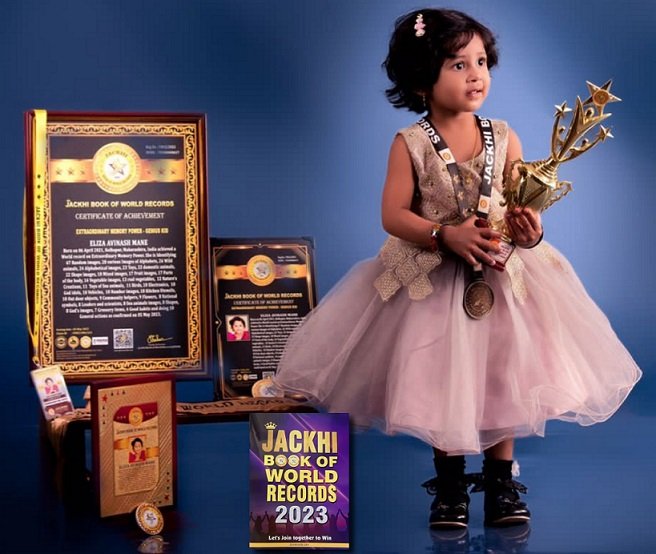 ELIZA AVINASH MANE, Born on 06 April 2021, Kolhapur, Maharashtra, India achieved a World record on Extraordinary Memory Power. She is Identifying 67 Random images, 28 various Images of Alphabets, 26 Wild animals, 24 Alphabetical images, 23 Toys, 23 domestic animals, 22 Shape images, 18 Mixed images, 17 Fruit images , 17 Parts of the body, 14 Vegetable images, 13 real vegetables, 12 Nature's Creations, 11 Toys of Sea animals, 11 Birds, 10 Electronics, 10 God idols, 10 Vehicles, 10 Number images, 10 Kitchen Utensils, 10 Out door objects, 9 Community helpers, 9 Flowers, 8 National symbols, 8 Leaders and scientists, 8 Sea animals images, 8 Shapes, 8 God's images, 7 Grossery items, 4 Good habits and doing 10 General actions.