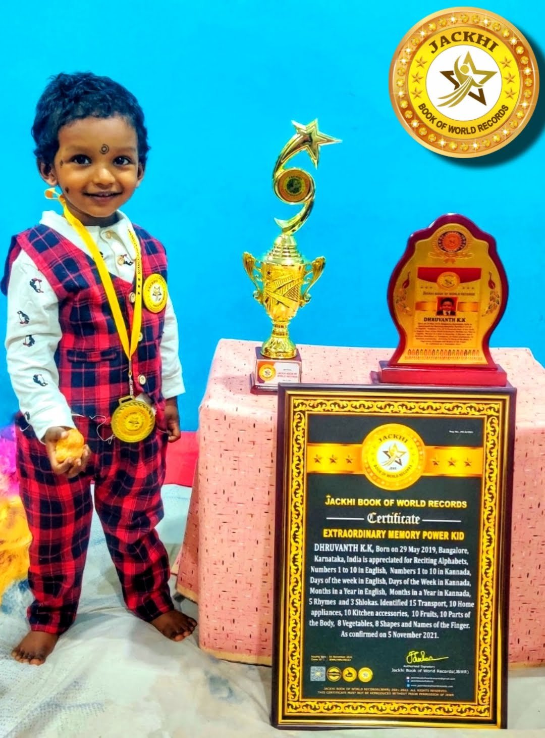 DHRUVANTH K.K, Born on 20th May2019, Bangalore, Karnataka, India is appreciated for Reciting Alphabets, Numbers 1to 10 in English, Numbers 1 to 10 in Kannada,Days of the week in English, Days of the Week in Kannada, Months in a Year in English, Months in a Year in Kannada, 5 Rhymes and 3 Shlokas. Identified 15 Transport, 10 Home appliances, 10 Kitchen accessories, 10 Fruits, 10 Parts of the Body, 8 Vegetables, 8 Shapes and Names of the Finger. As confirmed on 5 November 2021.