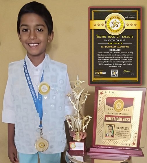 SIDDHARTH, Born on January 01,2019, Karnataka, India is an amazing kid, who is excellent in Identifying and reciting maximum flashcards in least time. He has identified Alphabet flash cards, 25 National symbols, Reciting 25 Rhymes, Days of the week , Months of the year and Counting numbers 1 to 100. We acknowledged his abilities and confer the title TALENT ICON 2k23.