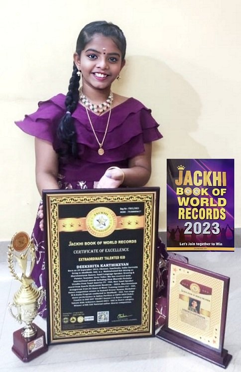 DEEKSHITA KARTHIKEYAN, Born on 20 September 2012, Chennai, Tamilnadu, India Currently living in Abu Dhbai, UAE. is a Multitalented Kid shining as Bharatanatyam Dancer, Tamil Language Speaker, Drawing & Painter, Youtuber, Story Teller. She has received many international awards including Elam Bharathi Pechalar Virudhu from Tamil America TV – USA, Best Tamil Speaker award from Kanchi Muthamizh Mandram – INDIA, Bharatanatyam Arangetram from JI2 Dance & Music Training Centre LLC – UAE, Dance competition winner in Nammil Oruvar Namma Muthalvar- M.K.Stalin Program conducted in Abu Dhabi -UAE, Two stage dance performance in Indian Pavilion at EXPO 2020 Dubai, Finalist in UAE GOT TALENT Season 2 in Dance category. Talentx Kids Achievers Award 2023 - UAE in Dance category. Winner of 8th UAE National online Abacus competition.