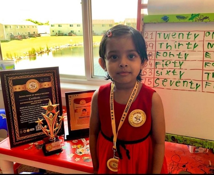 ISHANVI DAS, Born on October 6, 2018, lowa, USA is appreciated for Identifying more than 220 country flags and Reciting their capitals. Identifying more than 60 major constellations and Reciting of their families. Reverse counting from 100 to 0 and write their spelling. Reciting Multiplication table from 1 to 5. Doing addition and subtraction along with small multiplication. Good knowledge about solar systems - Planet and dwarf Planets, number of moons and rings of Planets. Reading English books and Simple Bengali sentences at the tender Age of 3 years 8 months as confirmed on 18 June 2022.