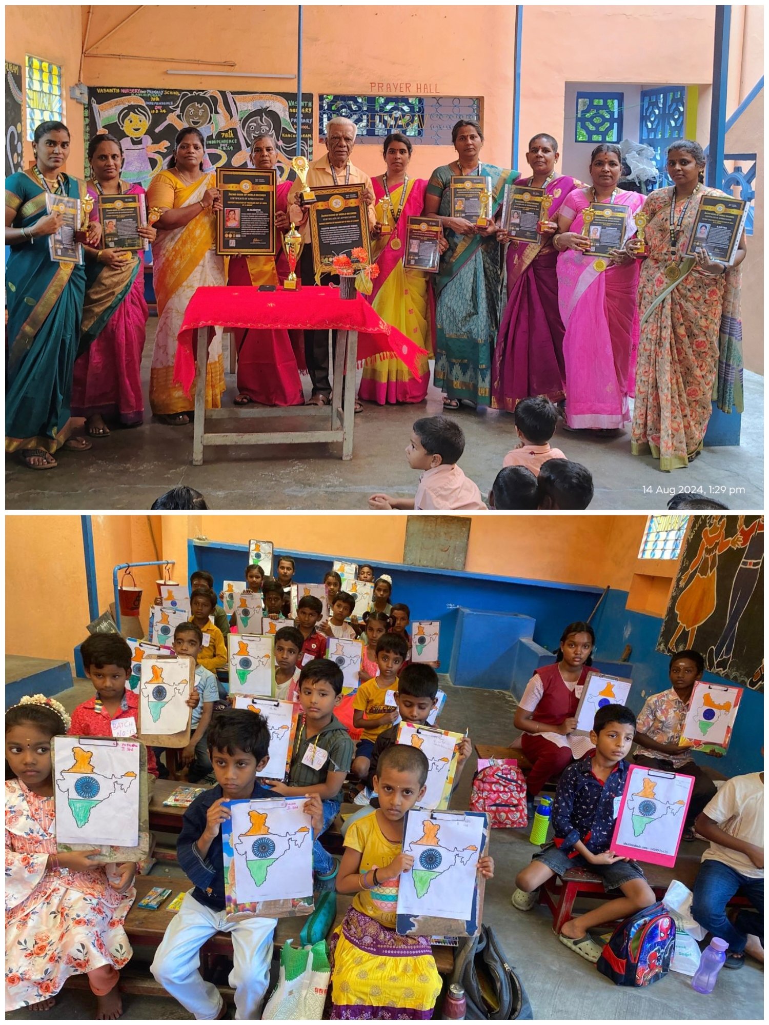 Kanchipuram, Tamilnadu, India organized a record-breaking event, for celebrating India's 78th Independence Day. 32 participants from various schools in Kanchipuram participated and created a Tricolour map of India within 20 minutes.