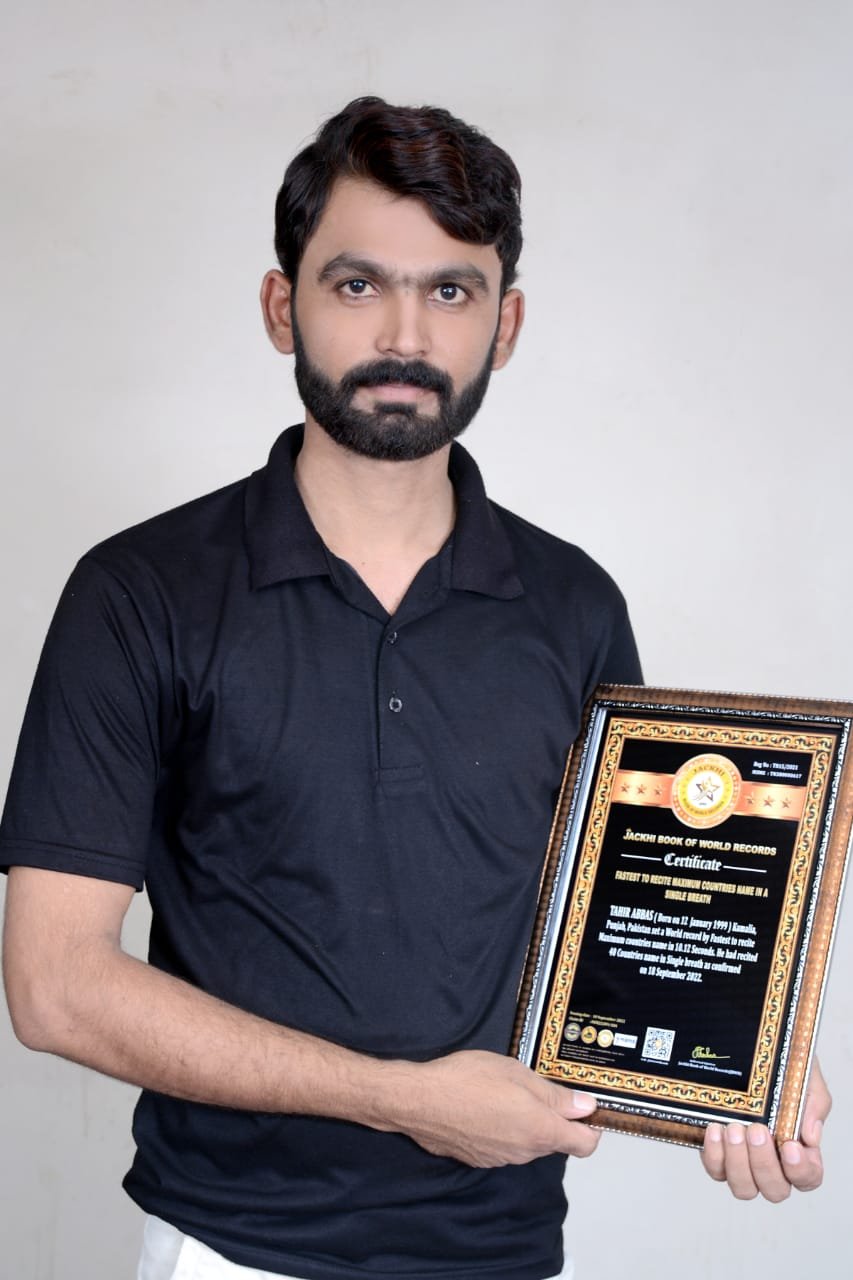 TAHIR ABBAS, Born on 12 January 1999, Kamalia, Punjab, Pakistan set a World record by Fastest to recite Maximum countries name in 10.12 Seconds. He had recited 40 Countries name in Single breath as confirmed on 18 September 2022.