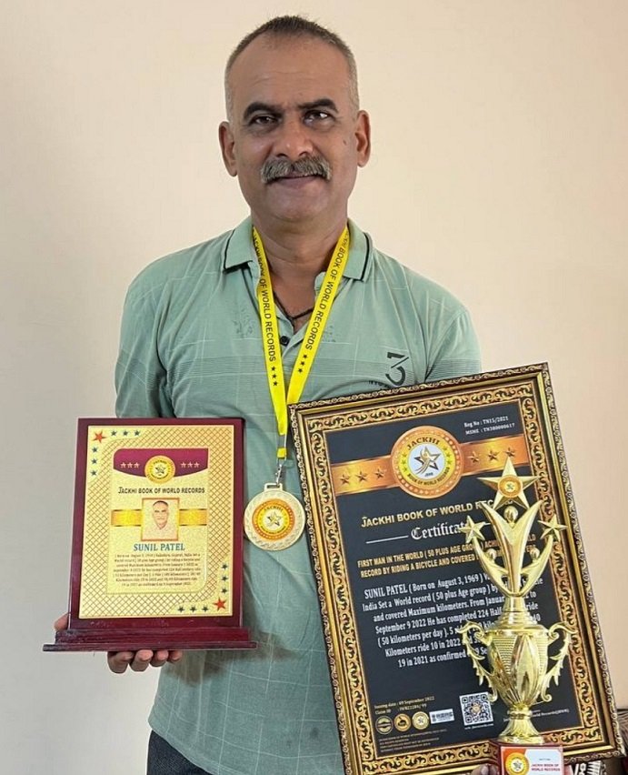 SUNIL PATIL, Born on August 3, 1969, Vadodara,Gujarat, India Set a World record( 50 plus Age group)by riding a bicycle and covered Maximum kilometers.From January 1 2022 to September 9 2022 He has completed 224 Half century ride ( 50 kilometers per day ). 5 ride ( 100 kilometers). 30/ 40 Kilometers ride 10 in 2022 and 30/40 Kilometers ride 19 in 2021 as confirmed on 9 September 2022.