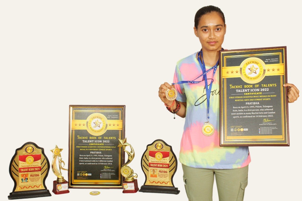 PRATHIBA, Born on April 21, 1995, Pitlam, Telangana State, India, is a first person, who achieved 3 International Golds in 3 different Combat sports, as confirmed on 14 February 2014.