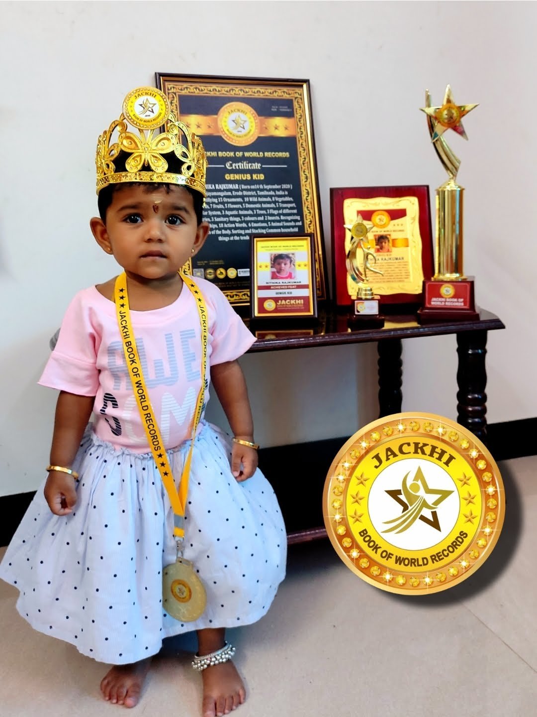 RITHIKA RAJKUMAR, Born on 14 th September 2021, Vijayamangalam, Erode District,Tamilnadu, India is Identifiying 15 Ornaments, 10 Wild Animals, 8 Vegetables, 6 Birds, 7 Fruits, 5 Flowers, 5 Domestic Animals, 5 Transport, 4 Solar System, 3 Aquatic Animals, 3 Trees, 3 Flags of different countries, 3 Sanitary things, 3 colours and 2 Insects. Recognizing Relationships, 18 Action Words, 6 Emotions, 5 Animal Sounds and 5 Parts of the Body. Sorting and Stacking Common household things at the tender Age of 13 Months. This achievement is recognized and registered on 13 October 2021.