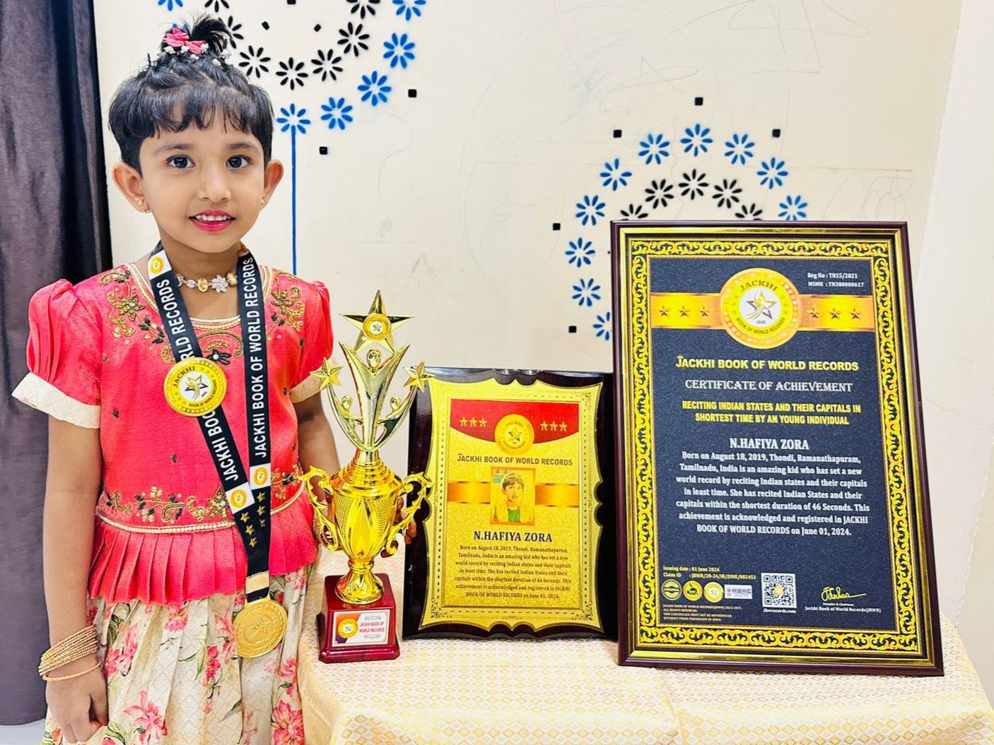 N.HAFIYA ZORA Born on August 18, 2019, Ramanathapuram, Tamilnadu, India is an amazing kid who has set a new world record by reciting Indian states and their capitals in least time. She has recited Indian States and their capitals within the shortest duration of 46 Seconds.