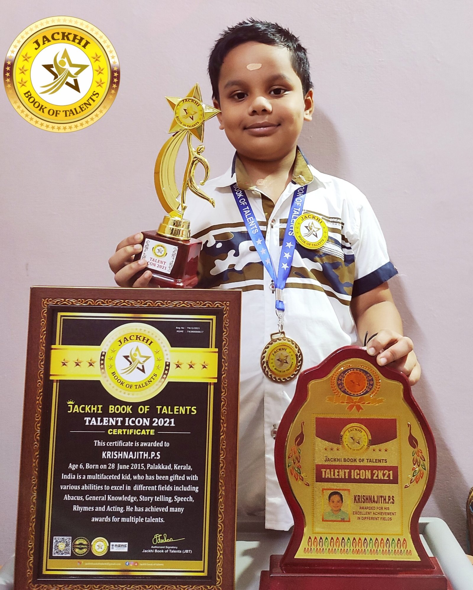 KRISHNAJITH. P.S, Age 6, Born on 28 June 2015, Palakkad, Kerala, India is a multifaceted kid, who has been gifted with different abilities to excel in different fields including Abacus, General Knowledge, Story telling, Speech, Rhymes and Acting. He has achieved many awards for multiple talents.