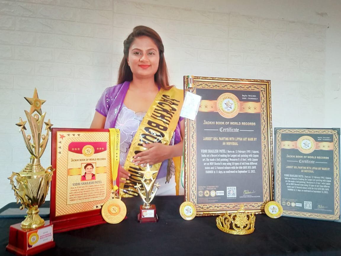 VIDHI SHAILESH PATEL, Born on 13 February 1993, Gujarat, India set a Record of making the Largest soil painting with Lippan art. She made a Soil painting ( Measures 8 x 8 feet ) with Lippan art on MDF Sheetof 6 mm using 10 types of soil from different states and 12 Natural colours with the title SAVE SOIL SAVE FARMER in 11 days, as confirmed on September 12, 2022.