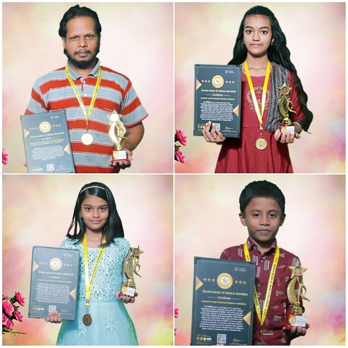 MASTER.M.JUSTIN, Born on 7 June 1979, Founder , Bright Group of Academics, Manali, Palavilai, Kanyakumari District, Tamilnadu, India organized the record LONGEST ELECTRONIC KEYBOARD ENSEMBLE with Three students at Karunya Auditorium, Kattukadai, Kanyakumari District, Tamilnadu, India. They uniformly performed with various styles like PRAYER SONG, TREBLE CLEF, BASE CLEF, RIGHT HAND EXCERCISE, LEFT HAND EXCERCISE, BOTH HAND EXCERCISE, UPPER STAVE, LOWER STAVE, SONGS RIGHT HAND, SINGS LEFT HAND, SONGS BOTH HAND AND NATIONAL ANTHEM for 3 hours 1 minute 6 Seconds relentlessly on 11.06.2022.