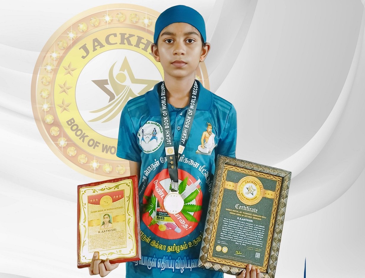 K.A. AATHISRI, born on February 24, 2019, daughter of SILAMBAM. VAITHI KARTHIKEYAN from T.S. Pettai, Chidambaram taluk, Cuddalore district, Tamil Nadu, India, has set a New World Record. She showcased various Martial art techniques, including SINGLE STICK SILAMBAM, DOUBLE STICK SILAMBAM, THEEPANTHAM, SURUL VAAL, STAR and ADI VARISAI, continuosly for 50 minutes while singing songs on Anti-drug awareness.