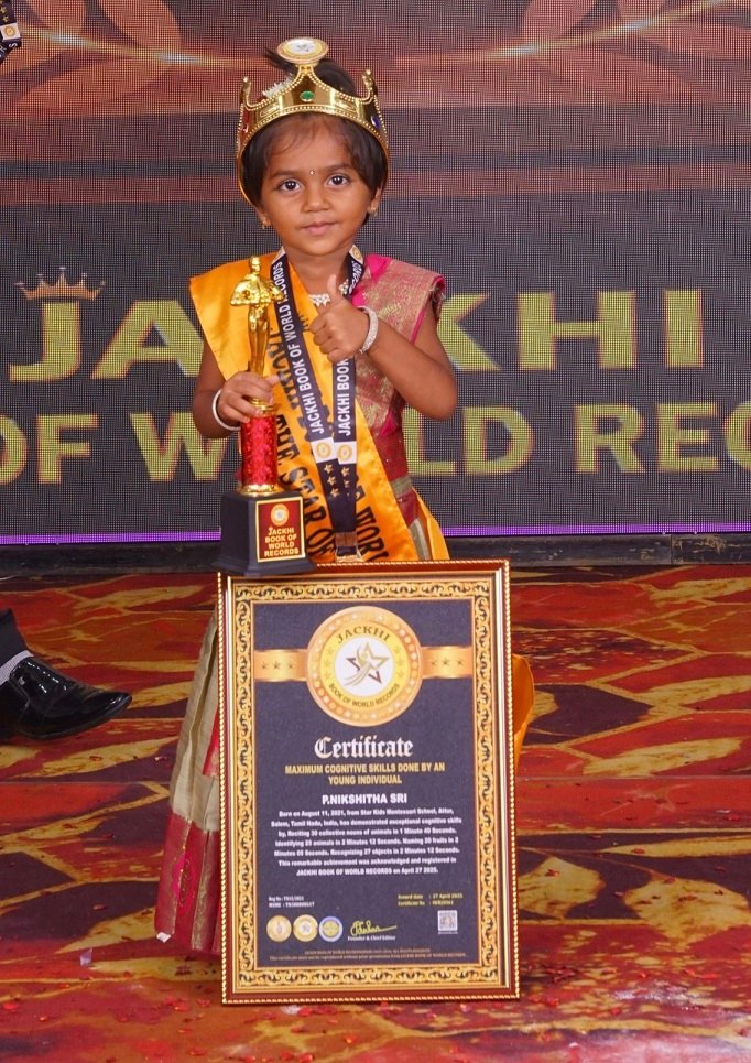 P. NIKSHITHA SRI, born on August 11, 2021, from Star Kids Montessori School,Attur, Salem, Tamil Nadu, India, has demonstrated exceptional cognitive skills by, Reciting 30 collective nouns of animals in 1 minute 40 seconds. Identifying 25 animals in 2 minutes 12 seconds. Naming 20 fruits in 2 minutes 05 seconds. Recognizing 27 objects in 2 minutes 12 seconds.