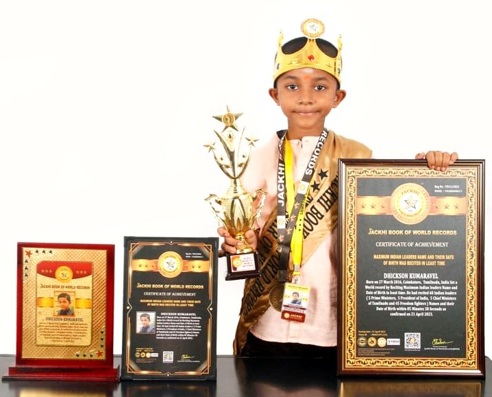 DHICKSON KUMARAVEL, Born on 27 March 2016, Coimbatore, Tamilnadu, India Set a World record by Reciting Maximum Indian leaders Name and Date of Birth in least time. He had recited 60 Indian leaders ( 5 Prime Ministers, 5 President of India, 5 Chief Ministers of Tamilnadu and 45 Freedom fighters) Names and their Date of Birth within 05 Minutes 38 Seconds.