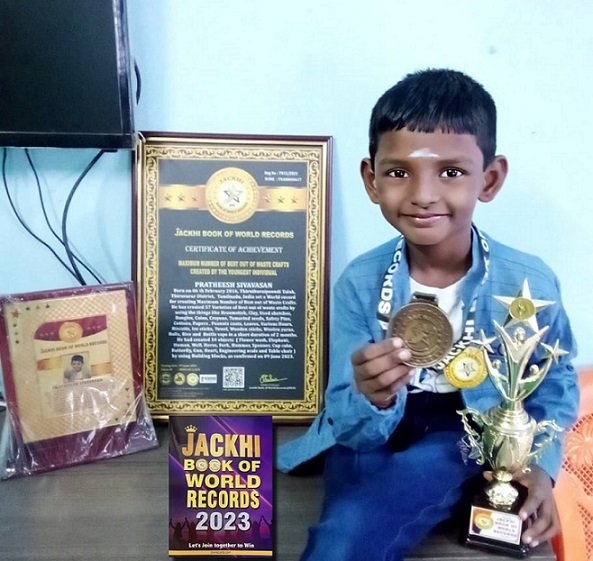 PRATHEESH SIVAVASAN, Born on 06 th February 2016, Thiruthuraipoondi Taluk, Thiruvarur District, Tamilnadu, India set a World record for creating Maximum Number of Best out of Waste Crafts. He has created 57 Varieties of Best out of waste crafts by using the things like Broomstick, Clay, Used sketches, Bangles, Coins, Crayons, Tamarind seeds, Safety Pins, Cottons, Papers , Peanuts coats, Leaves, Various flours, Biscuits, Ice sticks, Towel, Wooden sticks, Wollen yarns, Balls, Rice and Bottle caps in a short duration of 2 months. He had created 14 objects ( Flower wash, Elephant, Human, Well, Horse, Fork, Hammer, Spanner, Cup cake, Butterfly, Gun ,Heart, Engineering scale and Table chair by using Building blocks.