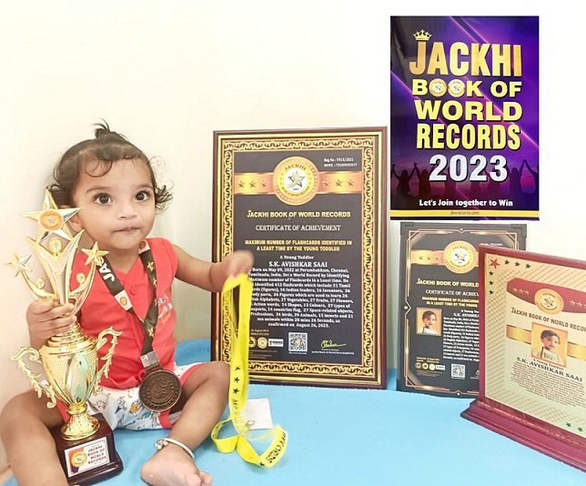 A young toddler S.K. AVISHKAR SAAI, Born on May 09, 2022 at Perumbakkam, Chennai, Tamilnadu, India, Set a World Record by Identifying Maximum number of Flashcards in a Least time. He has identified 452 flashcards which include 31 Tamil words (figures), 16 Indian leaders, 16 Inventors, 26 Body parts, 26 Figures which are used to learn 26 English Alphabets, 27 Vegetables, 27 Fruits, 27 Flowers, 25 Action words, 14 Shapes, 13 Colours, 27 types of Transports, 14 countries flag, 27 Space-related objects, 27 Professions, 34 birds, 39 Animals, 15 insects and 21 sea animals within 28 mins 26 Seconds.