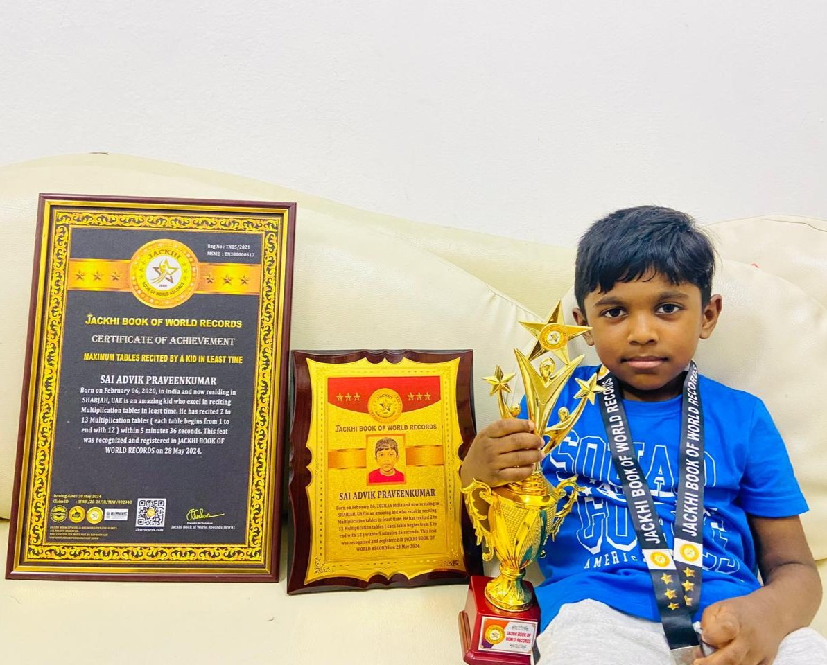 SAI ADVIK PRAVEENKUMAR, Born on February 06, 2020, in india and now residing in SHARJAH , UAE is an amazing kid who excel in reciting Multiplication tables in least time. He has recited 2 to 13 Multiplication tables ( each table begins from 1 to end with 12 ) within 5 minutes 36 seconds.