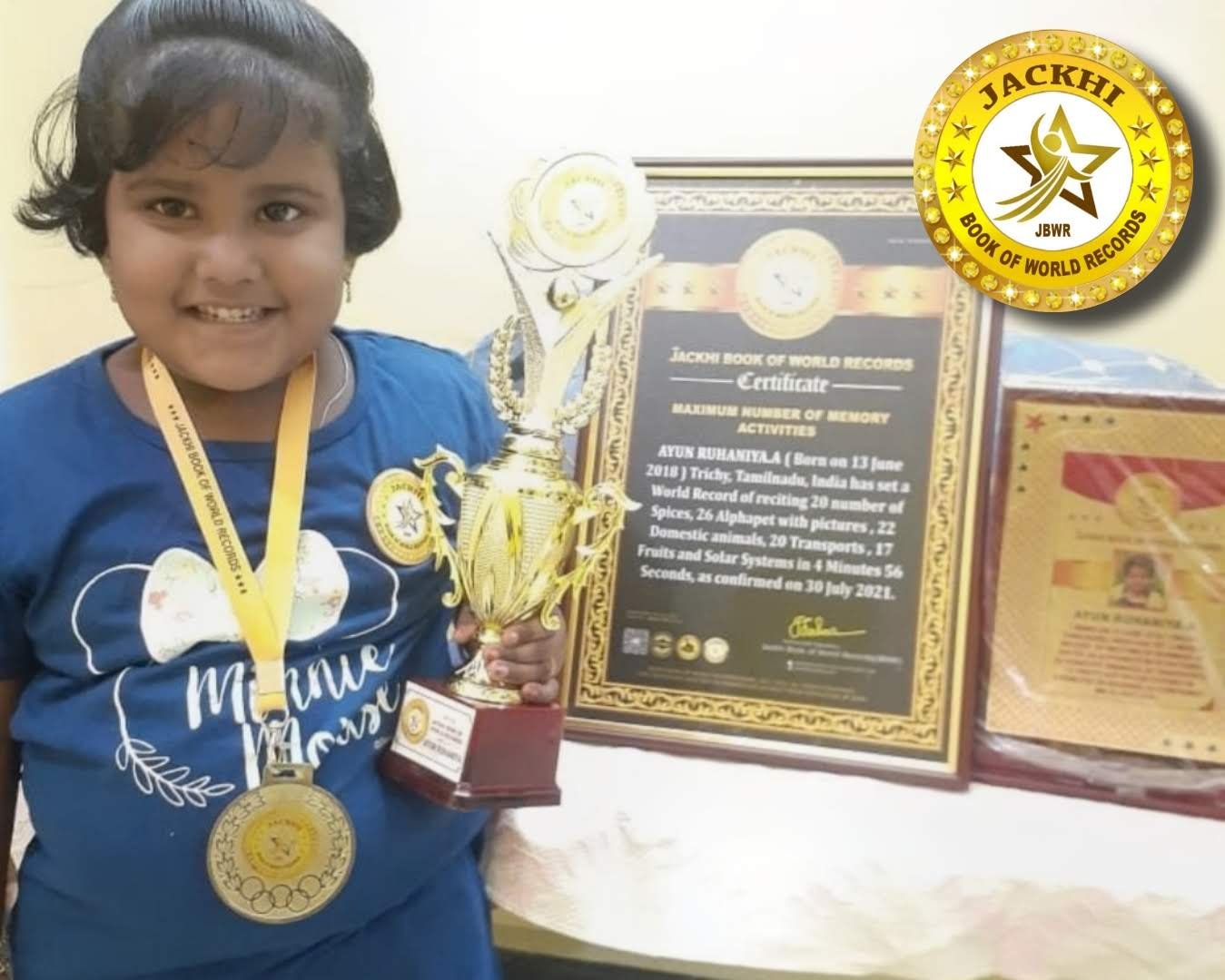 AYUN RUHANIYA.A (Born on 13 June 2018) Trichy,Tamilnadu, India has set a world record of reciting 20 number of spices, 26 Alphabet with pictures, 22 domestic animals, 20 transports, 17 fruits ,solar system,4 minutes and 56 seconds,as confirmed on 30 July 2021.