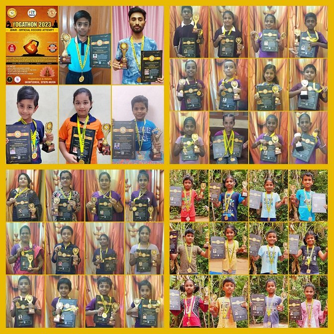 JACKHI CREATIONS and INTERNATIONAL CHAMPIONS ACADEMY Organized a Mass World Record event, entitled "YOGATHON 2023". This event was organized on the occasion of International Yoga day 2023 to emphasize HEALTH IS WEALTH. 456 participants across the country participated and presented Maximum Varieties of Yoga poses within 10 minutes.