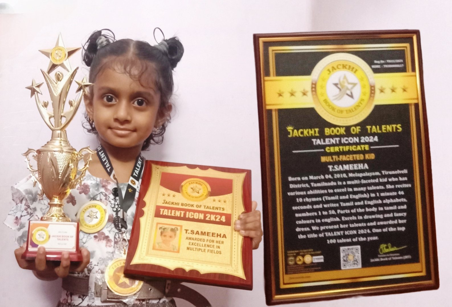 T.SAMEEHA, Born on March 04, 2018, Melapalayam , Tirunelveli District , Tamilnadu is a multi-faceted kid who has various abilities to excel in many talents. She recites 10 rhymes (Tamil and English) in 1 minute 46 seconds and writes Tamil and English alphabets, numbers 1 to 50. Excels in drawing and fancy dress. We present her talents and awarded her the title of TALENT ICON 2024. One of the top 100 talent of the year.