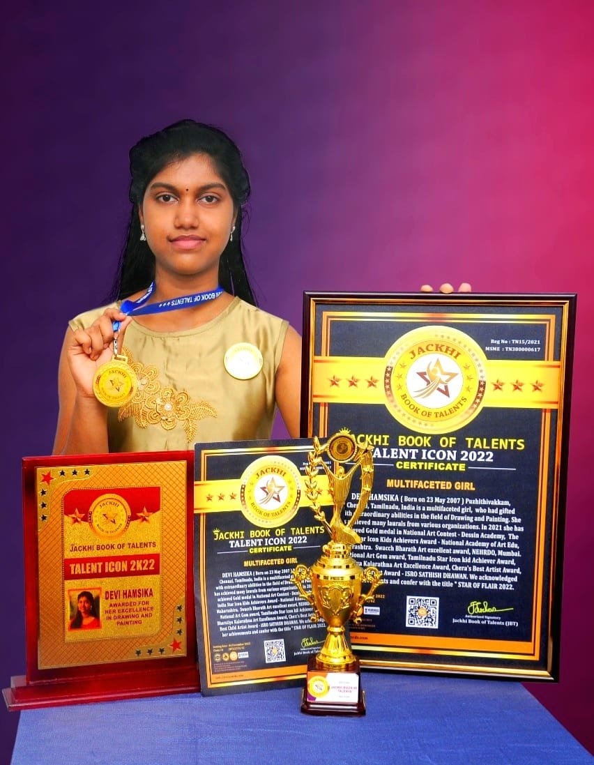 DEVI HAMSIKA, Born on 23 May 2007, Puzhithivakkam, Chennai, Tamilnadu, India is a multifaceted girl, who had gifted with extraordinary abilities in the field of Drawing and Painting. She has achieved many laurals from various organizations. In 2021 she has achieved Gold medal in National Art Contest - Dessin Academy, The India Star Icon Kids Achievers Award - National Academy of of Art Edu, Maharashtra. Swacch Bharath Art excellent award, NEHRDO ,Mumbai.National Art Gem award, Tamilnadu Star Icon kid Achiever Award, Bharatiya Kalarathna Art Excellence Award, Chera's Best Artist Award, Best Child Artist Award - ISRO SATHISH DHAWAN. We acknowledged her achievements and confer with the title " STAR OF FLAIR 2022.