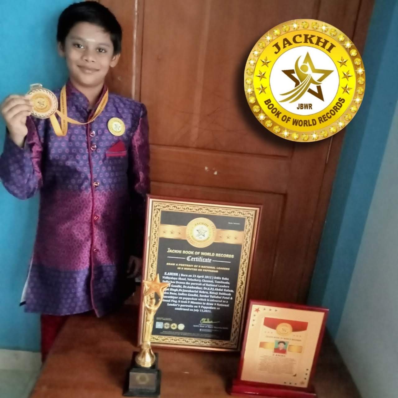 S.ANISH ( Born on 23 April 2012) DAVe Baba Vidhyalaya School,Velachery,Chennai, Tamilnadu, India has Drawn the portrait of NationalLeaders MahatmaGandhi, Dr.Ambedkar, Dr.A.P.J Abdul Kalam,Bhagat Singh, Dr.Jawaharlal Nehru,Netaji Subhash Chandra Bose,Indira Gandhi, Sardar Vallabai Patel & Bharathiyar on pappadam which is coloured as a national flag. It took 9 minutes to draw 9 National leader's portraits on 9 Pappadams, as confirmed on July 12 ,2021.