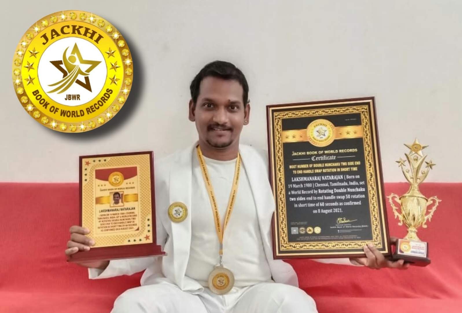 LAKSHMANARAJ NATARAJAN, Born on 19 March 1980 Chennai, Tamilnadu,India set a world record by Rotating Double Nunchaku two sides end to end handle swap 50 rotation in short time of 60 seconds as confirmed on 08 August 2021.