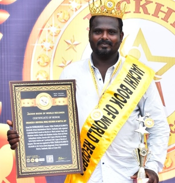 Asan.Dr.P.SUBRAMANIAN, Founder, VEERA THAMILAR SILAMBATTA KALAGAM, Sirkali, Mayiladuthurai District, Tamilnadu, India organized 6 Individual World records on Martial art. Which includes Single stick Silambam rotation, Double stick Silambam rotation, Metal and Wood Gathayutham rotation, Exercise with 3 types of Martial art stones, Karla-Kattai rotation and 5 performed with 5 types of Martial art weapons. This event was organized by VEERA THAMILAR SILAMBATTA KALAGAM at L.M.C Hr.Sec.School playground, Sirkali, Mayiladuthurai District, Tamilnadu, India on 26 June 2022.