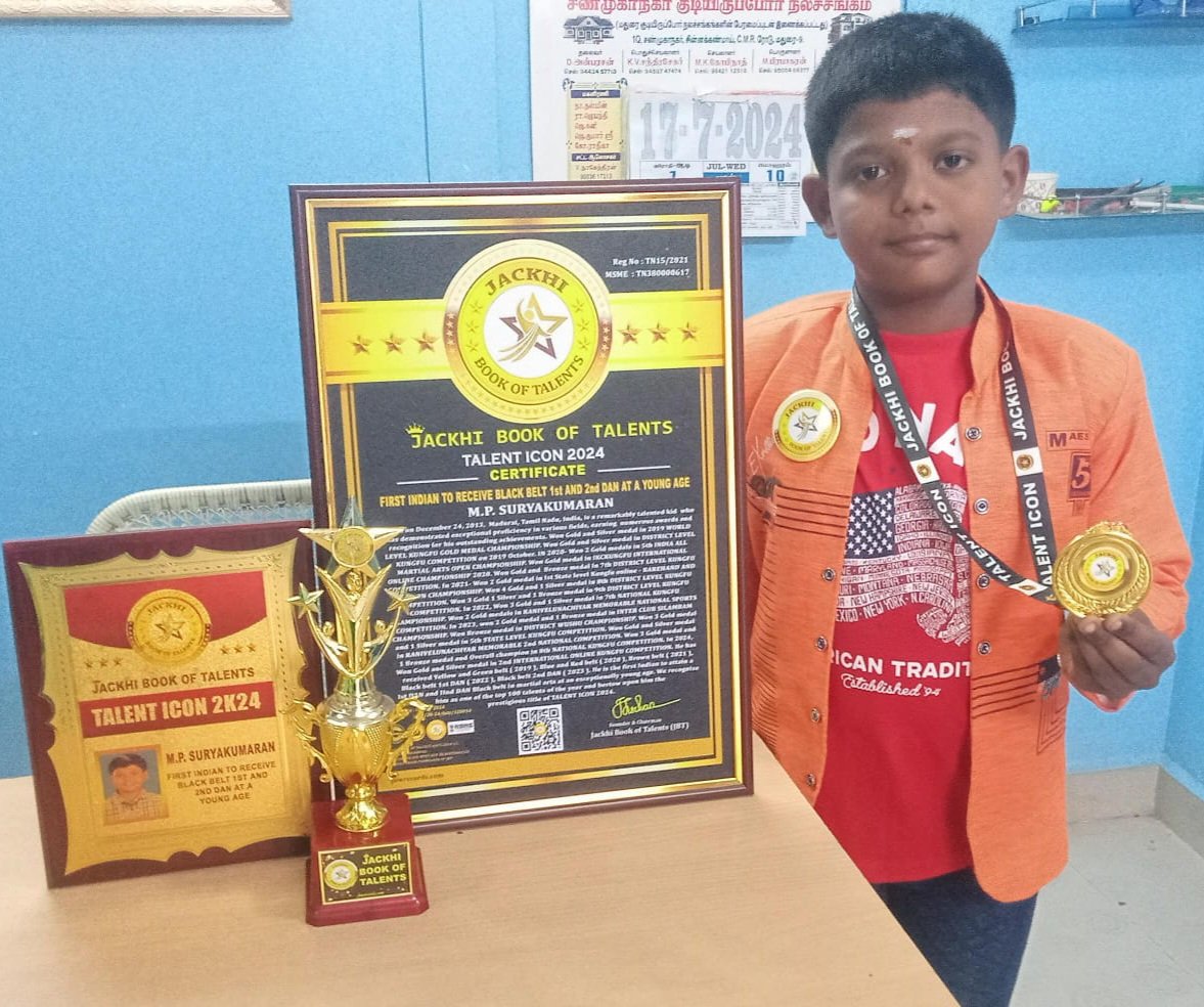 M.P. SURYAKUMARAN, born on December 24, 2013, Madurai, Tamil Nadu, India, is a remarkably talented kid who has demonstrated exceptional proficiency in various fields, earning numerous awards and recognition for his outstanding achievements. Won Gold and Silver medal in 2019 WORLD LEVEL KUNGFU GOLD MEDAL CHAMPIONSHIP. Won Gold and Silver medal in DISTRICT LEVEL KUNGFU COMPETITION on 2019 October. IN 2020 - Won 2 Gold medals in 5th INDIA ALL MARTIAL ARTS OPEN CHAMPIONSHIP. Won Gold medal in IKCKUNGFU INTERNATIONAL ONLINE CHAMPIONSHIP 2020. Won Gold and Bronze medal In 7th DISTRICT LEVEL KUNGFU COMPETITION. In 2021- Won 2 Gold medal in Ist State level Kungfu online - BAREHAND AND WEAPON CHAMPIONSHIP. Won 4 Gold and 1 Silver medal in 8th DISTRICT LEVEL KUNGFU COMPETITION. Won 3 Gold 1 Silver and 1 Bronze medal in 9th DISTRICT LEVEL KUNGFU COMPETITION. In 2022, Won 3 Gold and 1 Silver medal in 7th NATIONAL KUNGFU CHAMPIONSHIP. Won 2 Gold medals in RANIVELUNACHIYAR MEMORABLE NATIONAL SPORTS COMPETITION. In 2023, won 2 Gold medal and 1 Bronze medal in INTER CLUB SILAMBAM CHAMPIONSHIP. Won Bronze medal in DISTRICT WUSHU CHAMPIONSHIP. Won 3 Gold medal and 1 Silver medal in 5th STATE LEVEL KUNGFU COMPETITION. Won Gold and Silver medal in RANIVELUNACHIYAR MEMORABLE 2nd NATIONAL COMPETITION. Won 3 Gold medal and 1 Bronze medal and Overall champion in 8th NATIONAL KUNGFU COMPETITION. In 2024, Won Gold and Silver medal in 2nd INTERNATIONAL ONLINE KUNGFU COMPETITION. He has received Yellow and Green belt ( 2019 ), Blue and Red belt ( 2020 ), Brown belt ( 2021 ), Black belt 1st DAN ( 2022 ), Black belt 2nd DAN ( 2023 ). He is the first Indian to attain a Ist DAN and IInd DAN Black belt in martial arts at an exceptionally young age. We recognize him as one of the top 100 talents of the year and bestow upon him the prestigious title of TALENT ICON 2024.